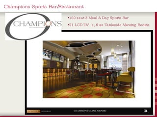 . Located in the courtyard miami airport in the miami marriott airport campus champions sports bar miami is the perfect spot. MIA on Zomato - Sports Bars in Airport. Cheer for your local sports team and enjoy the comradery in our lively restaurant near the miami airport.